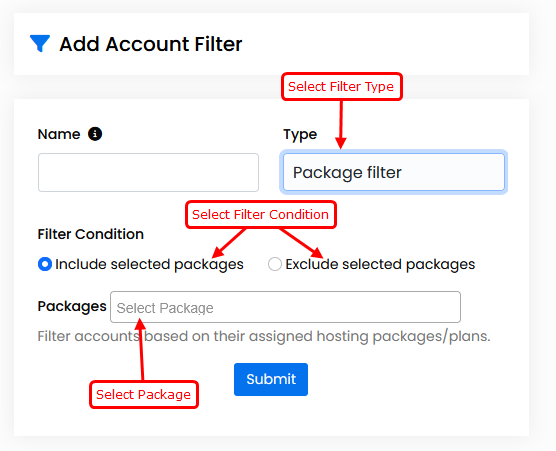 The Package Filter allows you to include or exclude accounts based on their assigned hosting package. This is helpful when you want to back up only accounts on specific service plans or tiers.