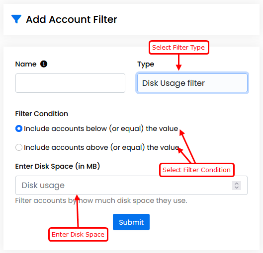 The Disk Usage Filter allows you to include or exclude accounts based on their disk space usage. This is useful for prioritizing high-usage accounts or skipping accounts that consume very little space.