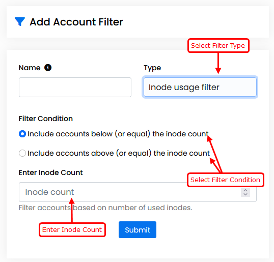 The Inode Usage Filter allows you to filter accounts based on their inode consumption. Inodes represent the number of files and directories used by an account, which is especially important on servers with inode limits.
