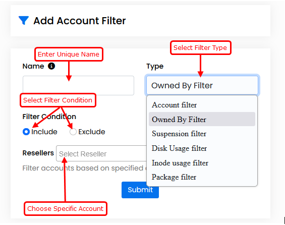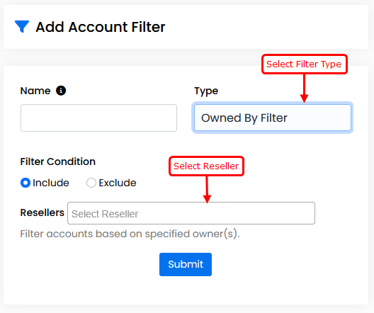 The Owned By Filter allows you to include or exclude accounts based on their owner (typically a reseller or admin). This is useful when you want to target accounts managed by a specific user or reseller.