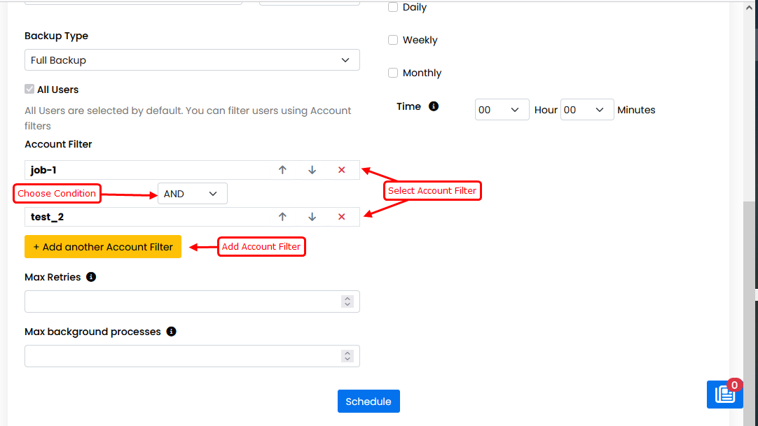 • Backup Scheme : Schedule the frequency of the backup job to run automatically. You can select any option fromHourly, Daily, Weekly, Monthly