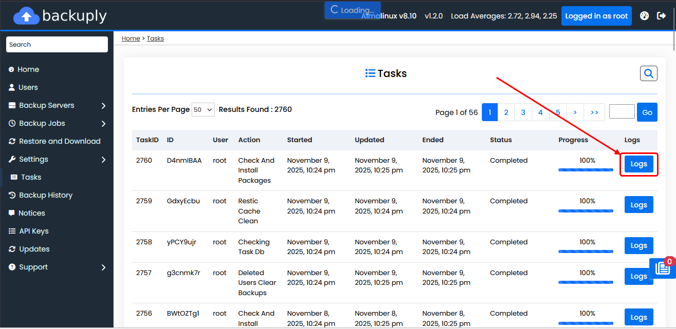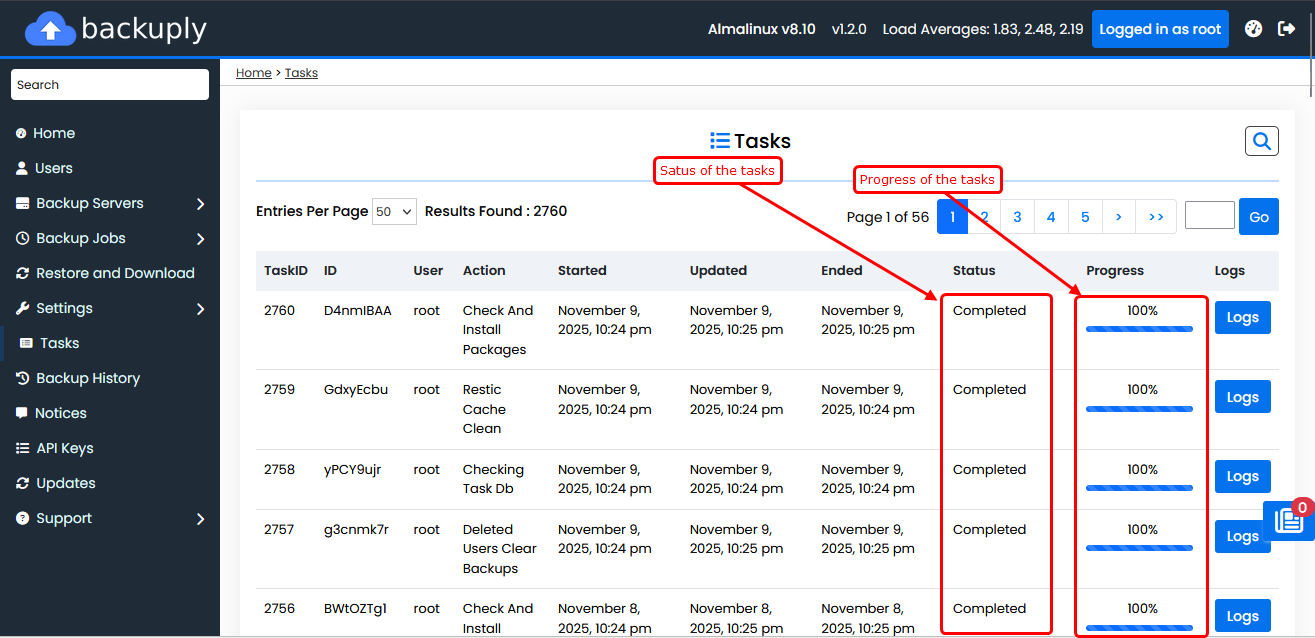 Backuply provides a complete view of all backup, restore, and other tasks.