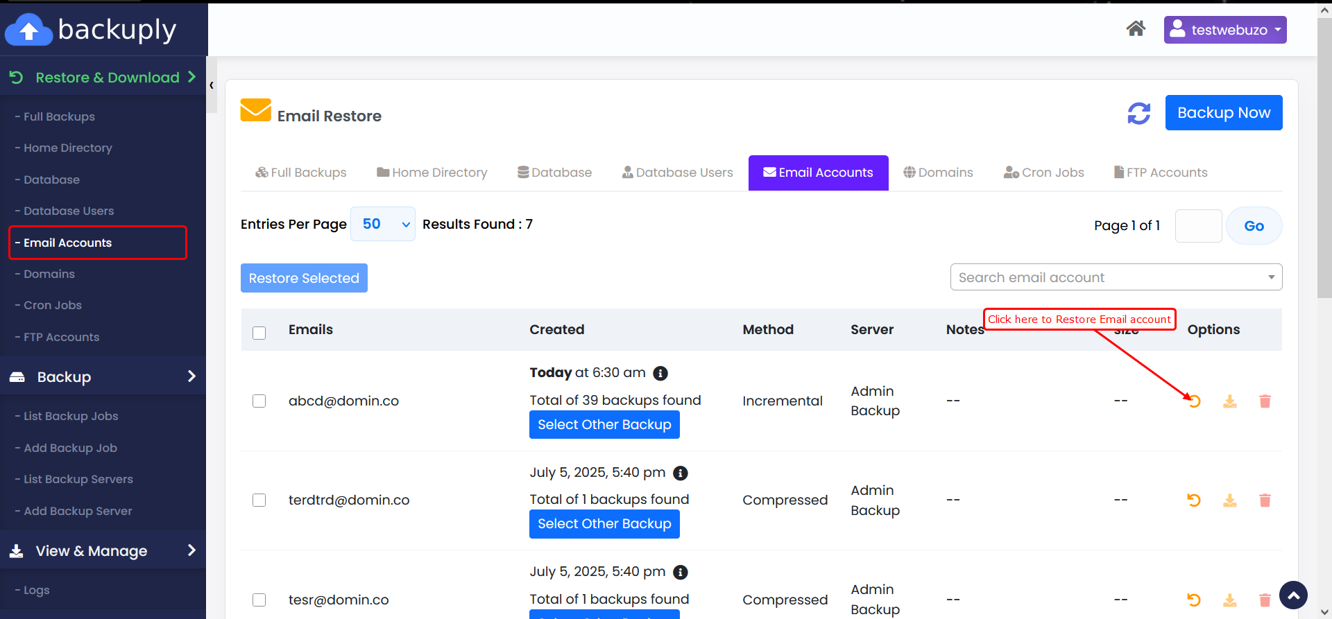 select the email account(s) you want to restore. Then, choose the backup date you wish to restore from, and click the Restore icon to begin the process.