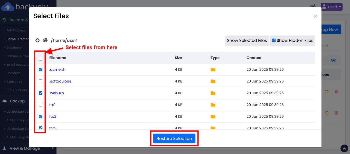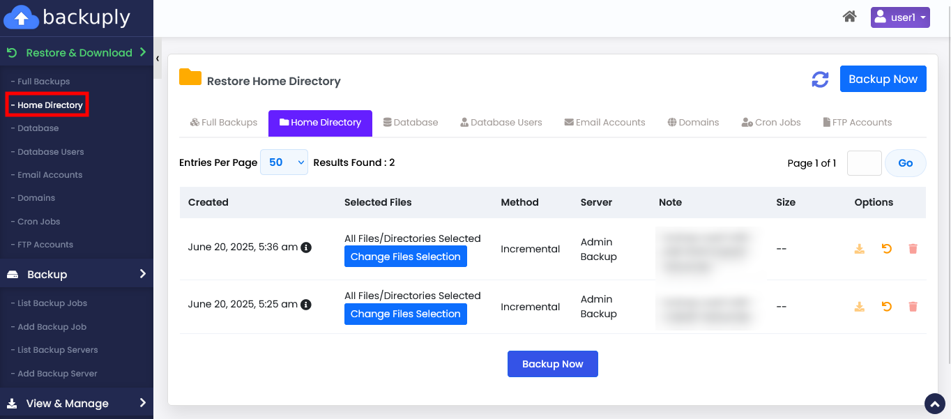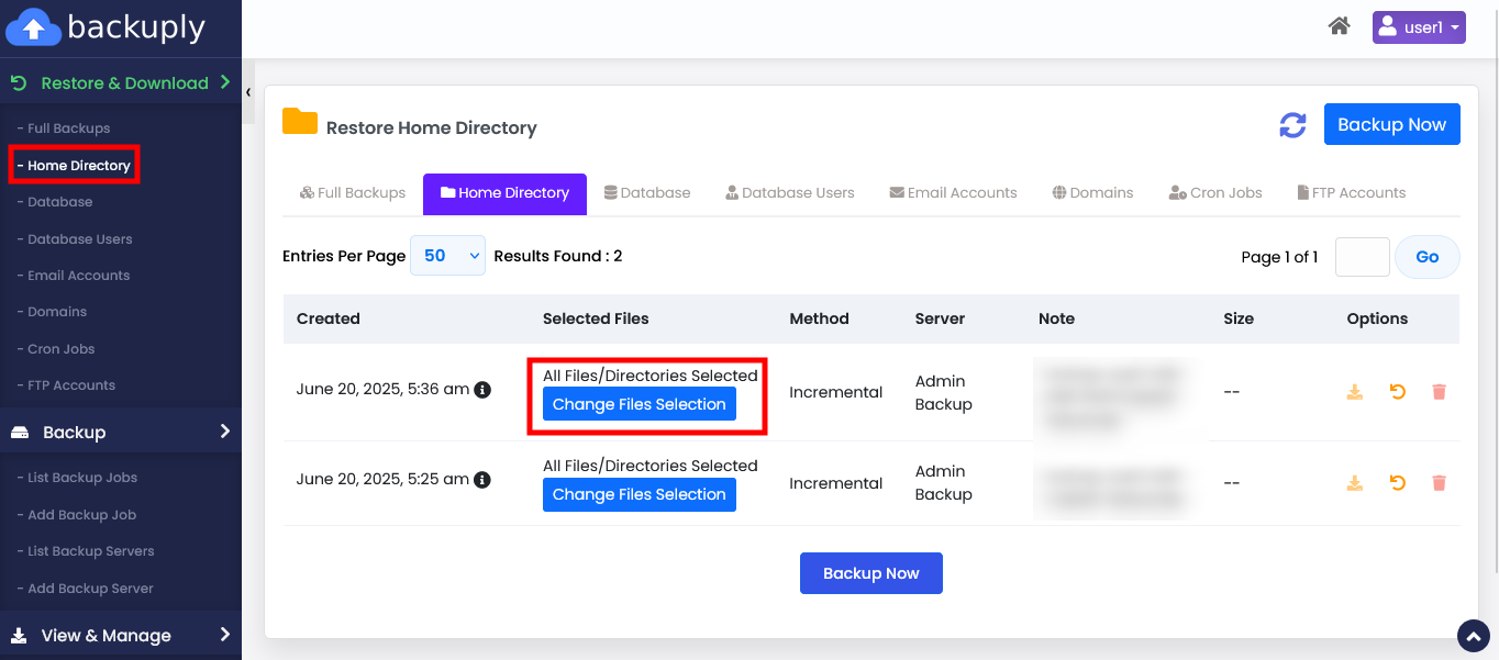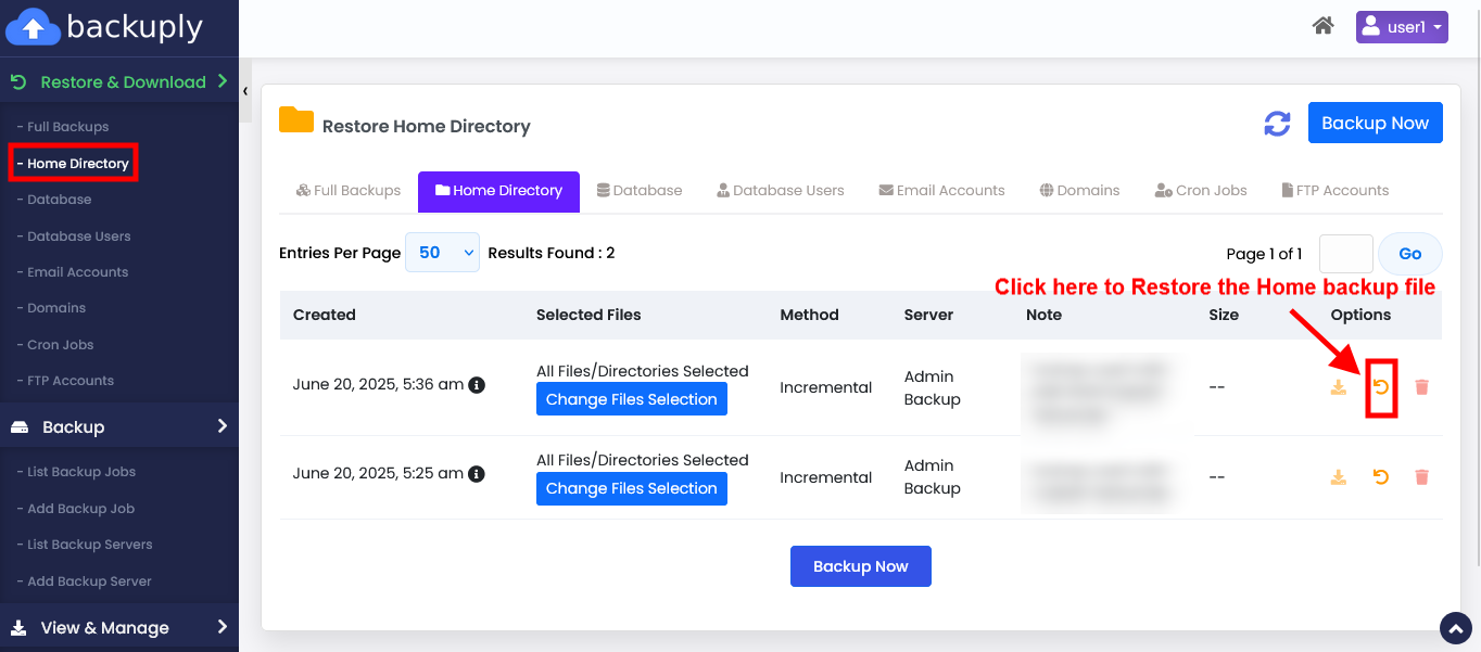 Navigate to the Backuply Enduser panel > Restore & Download > Home Directory wizard.
