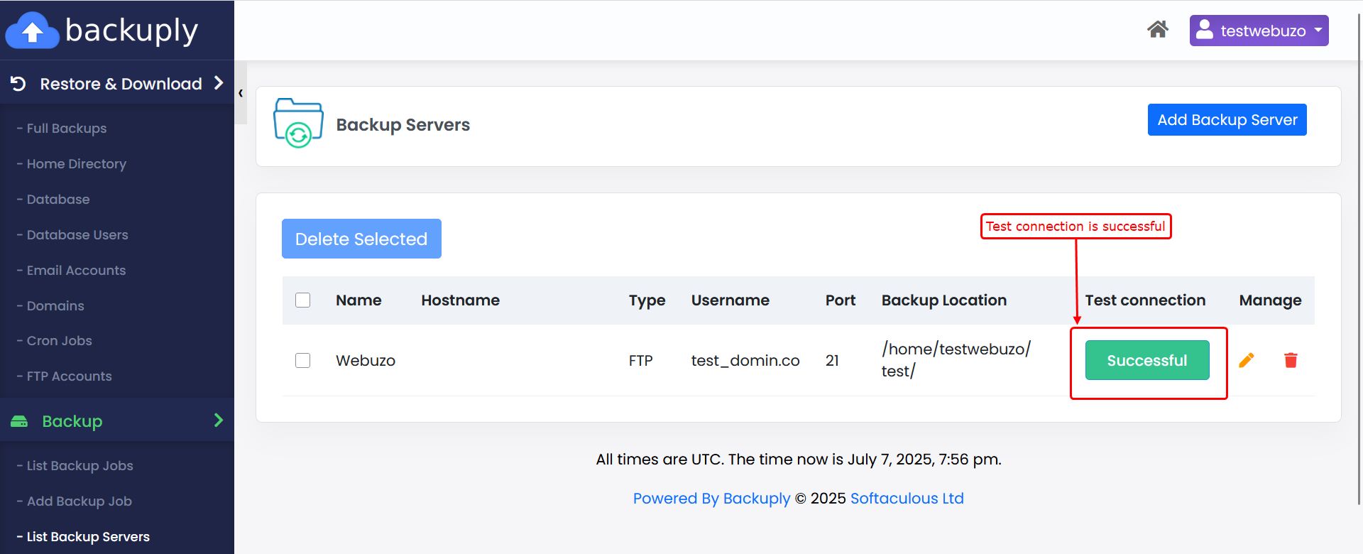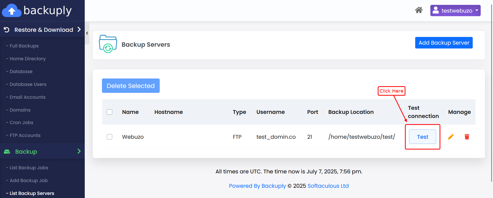 1) Clicking the Test button verifies whether Backuply can connect to the configured server.