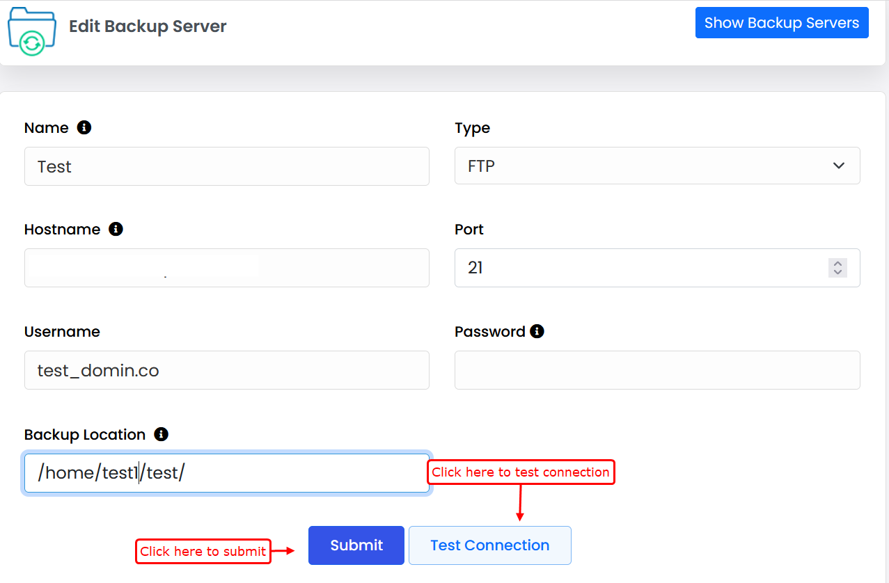 After updating your backup server configuration, first click on “Test connection” to verify the connection. Only if the test is successful, proceed to click the Submit button to save the changes.