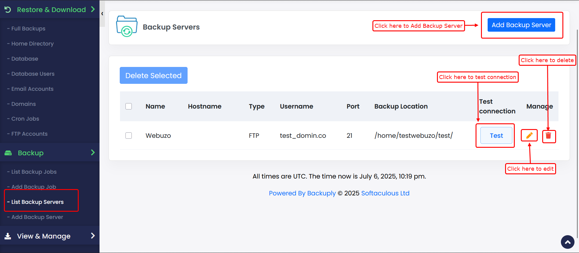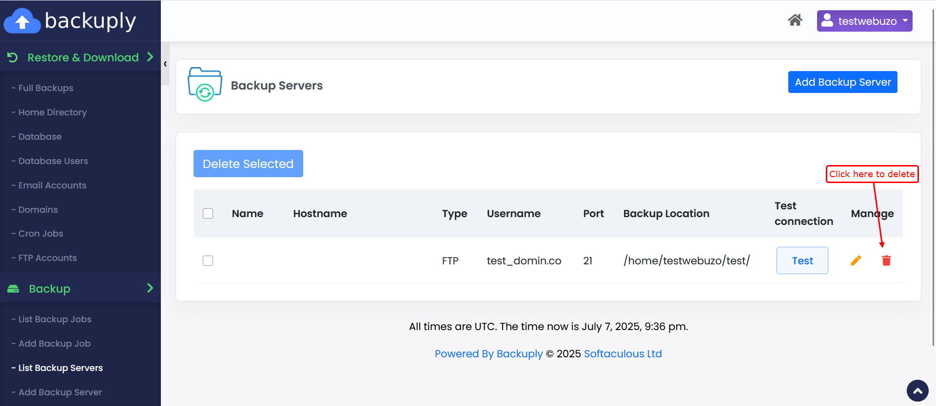 5) Clicking the Delete button will remove the selected backup server from your configuration.